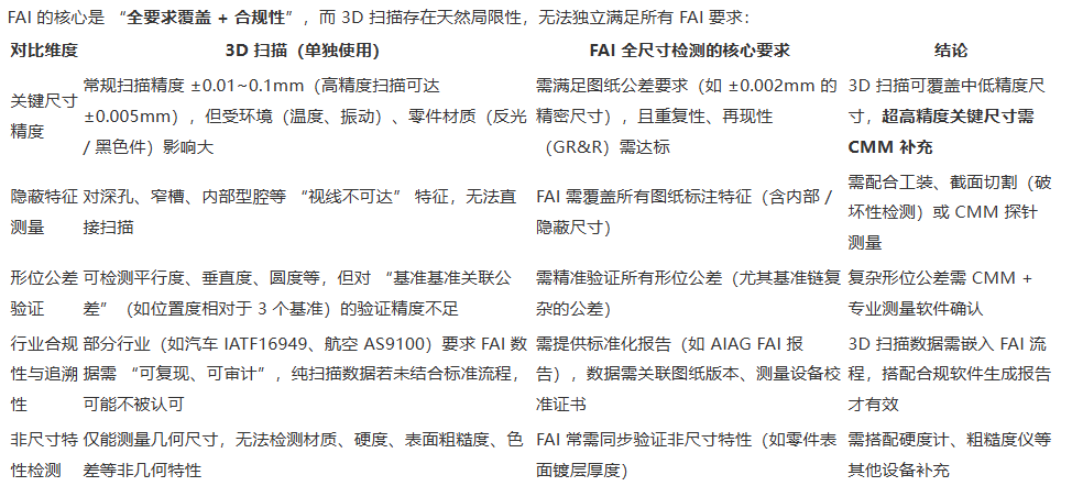 FAI 的核心是 “全要求覆盖 + 合规性”,而 3D 扫描存在天然局限性,无法独立满足所有 FAI 要求:
