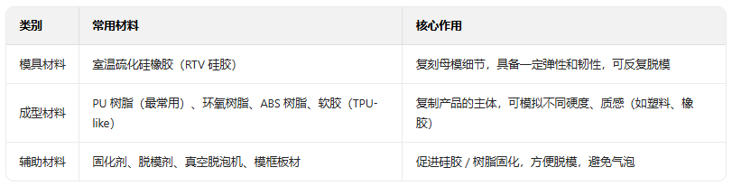 浇注材料调配与灌注:选择液态成型材料(常用 PU 树脂、环氧树脂、ABS-like 树脂,也可添加颜料调色),按比例混合材料与固化剂,真空脱泡后,通过浇注口注入硅胶模具型腔。